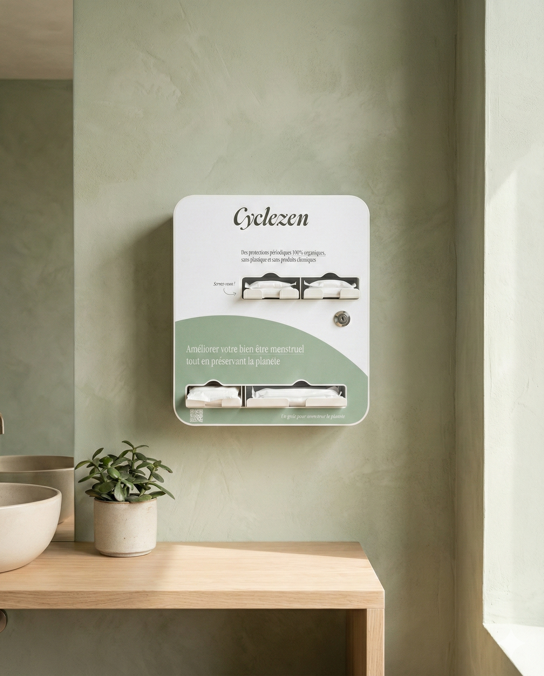 Cyclezen installe dans vos sanitaires un distributeur de protections périodiques 100 % organiques, clé en main et sans contrainte.